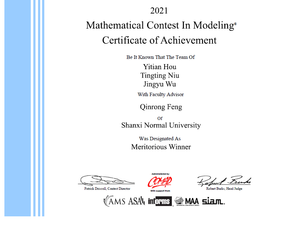 近日,第37届美国国际老员工数学建模竞赛(MCM)与交叉学科建模竞赛(ICM)成绩公布,英国365集团公司组织的15支建模队伍在教师冯琴荣、周正勇、王兆浩的培训和指导下,克服疫情影响,13支队伍完成论文成功参与,继2020年获得一等奖荣誉(Meritorious Winner),今年再创佳绩斩获一等奖一项。