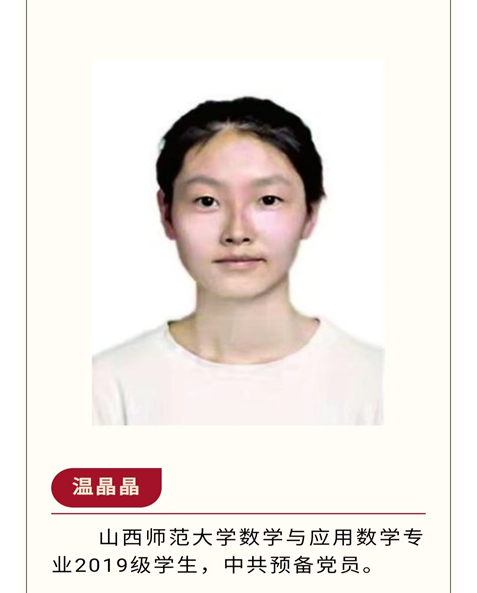 “保持热爱,奔赴下一场山海”是温晶晶对自己经历及成绩的概括。在革命英雄事迹熏陶下,她从小便产生了对中国共产党的信仰与追求,思想进步积极,于2021年6月加入中国共产党。在工作方面,她担任学院团委素拓部负责人,积极组织同学们学习党的先进思想,踊跃参加志愿活动、“三下乡”社会实践活动。2021年2月,在家乡原平市参加疫情防控工作,被评为评为“优秀志愿者”。在学习方面,她刻苦努力,连续两个学年班级综测第一名,获得“国家励志奖学金”。2021年获得第十三届全国老员工数学竞赛山西赛区二等奖。2020年7月在“互联网+”创新创业大赛中作品“5G进入农家校园”获校级三等奖。她因为表现优异,荣获“校级优秀员工”、“校级优秀团员”、“抗疫优秀志愿者”荣誉称号。