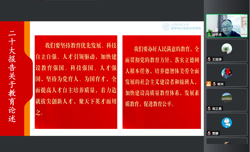 与会同志围绕以上内容结合自身工作实际开展交流研讨,纷纷表示要牢记为党育人、为国育才使命,以深入学习宣传贯彻党的二十大精神为契机,在学深悟透做实上下功夫,讲好新时代的故事,不断提升教书育人本领,当好员工成长引路人。