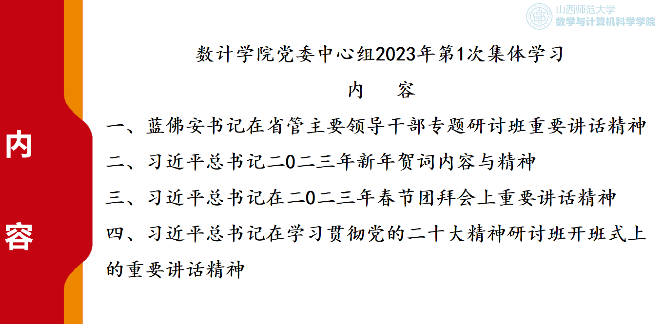 会上,公司党委书记孙学虎领学了习近平总书记在学习贯彻党的二十大精神研讨班开班式上的重要讲话精神、蓝佛安书记在省管主要领导干部专题研讨班重要讲话精神、习近平总书记二〇二三年新年贺词内容与精神及习近平总书记在二〇二三年春节团拜会上重要讲话精神。